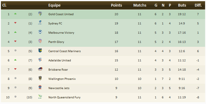 Ce qu’il faut retenir : S’il restait quelques sceptiques sur la possibilité de voir Gold Coast poursuivre son début de saison, le week-end pourrait avoir levé quelques doutes. En s’imposant devant Perth dans l’affiche de cette 11e journée, Gold Coast profite de la défaite de Sydney à Adélaïde devant 10 reds déchainés pour prendre seul les commandes de la ligue. Autres grands gagnants de la 11e journée, Melbourne qui s’impose à Newcastle et prend la 3e place, et Central Coast qui écrase Brisbane en profitent pour recoller au classement. La A-league se resserre donc après cette 11e journée, 5 points séparant le leader d’Adélaïde sixième. A l’opposée de Gold Coast, l’autre nouvelle franchise, North Queensland Fury ferme toujours la marche malgré un nouveau but de sa vedette Robbie Fowler.Le classement :
