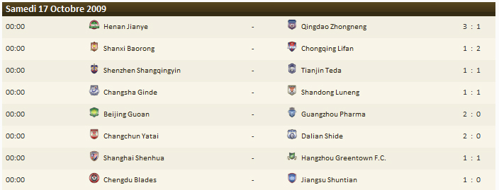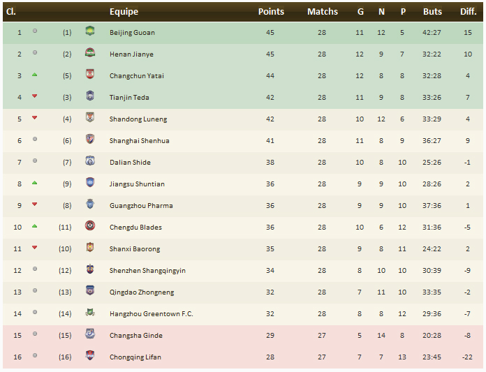 Ce qu’il faut retenir : S’il est évident que chaque point est essentiel en fin de saison, le championnat chinois pousse cette évidence à son paroxysme à deux journées de la fin. Dans une compétition où le titre de champion se joue entre 6 équipes, chaque contre-performance peut être fatale. Ainsi, les matchs nuls concédés par Shanghai, Tianjin et Shandong pourraient leur coûter le titre. D’autant que pendant ce temps, Beijing, Henan et Changchun se sont imposés et prennent le large. Avec quatre points de retard et 6 points à prendre, l’affaire parait compromise pour Shanghai. Pour Shandong et Tianjin, l’espoir demeure mais il faudra absolument deux contre performances pour les équipes précédent. La semaine prochaine, pour l’avant dernière journée de cette Chinese Super League passionnante, Tianjin se déplacera à Henan pour y disputer sa finale. Une victoire d’Henan qualifierait ces derniers pour la prochaine Ligue des Champions et leur permettrait de rêver encore au titre, sachant qu’ils se sont séparés du leader Beijing par 5 petits buts. Le week-end prochain pourrait ainsi être décisif pour l’attribution des billets pour la prochaine Ligue des Champions, en revanche, pour le titre, il faudra patienter les dernières secondes de l’ultime journée.Le classement :