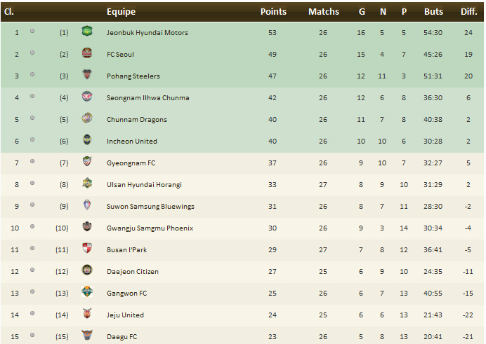 Ce qu’il faut retenir : A deux journées de la fin de la saison régulière, il ne reste que deux place à distribuer pour les play-offs. En s’imposant sur sa pelouse, Seongnam a ainsi décroché sa place en play-offs mais surtout élimine définitivement le champion sortant Suwon. Restent désormais deux places pour lesquelles trois clubs vont lutter. Chunnam, Incheon et Gyeongnam ne sont séparés que de trois points et l’ont tous emporté ce week-end. Difficile de prédire à l’avance qui décrochera le précieux sésame puisque tous se déplaceront le week-end prochain avant de recevoir pour l’ultime journée. Autre lutte importante, celle de la première place, qualifiant directement pour la demi-finale du championnat. Dans cette course, Pohang a perdu tout espoir, bien qu’ayant écarté Gangwon et Séoul a cédé du terrain après avoir été accroché chez lui par Busan. La première place pourrait donc revenir à Jeonbuk qui a poursuivi sa série de victoire (5 consécutives) et possède désormais 4 points d’avance sur le second. Pohang et Séoul lutteront pour la seconde place, qualificative pour le second tour des play-offs.Le classement :