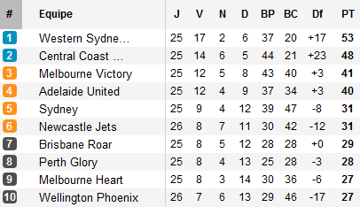 Si Western Sydney et Central Coast sont assurés de disputer les demi-finales, la bataille pour les play-offs s’annonce passionnante puisqu’elle concerne encore presque toutes les équipes de la ligue.