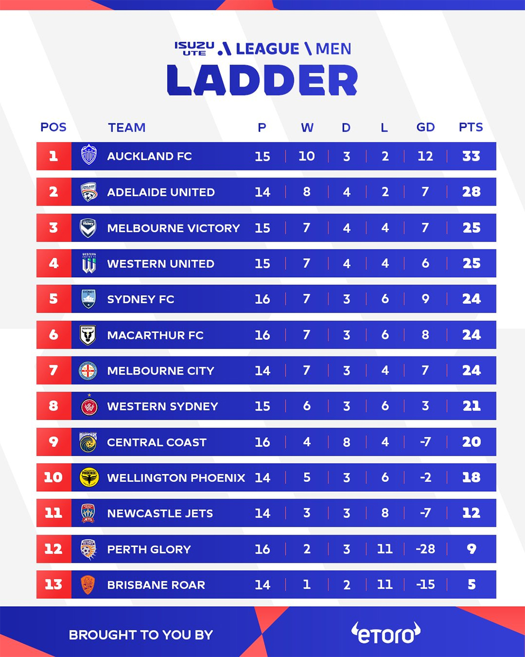À l’issue de ce mois marathon, le classement offre un suspense haletant. Si Auckland FC mène la danse avec cinq points d’avance sur Adelaide United et huit sur Melbourne Victory, la bataille pour les places en play-offs s’annonce féroce, d’autant plus que Central Coast, neuvième, n’est qu’à quatre points du top 6.