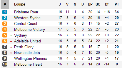 De leur côté, les leaders n’ont pas trébuché. Western Sydney s’impose sans trembler chez lui devant les Glory de Gallas alors que Brisbane arrache un précieux succès face à l’équipe en forme du moment Wellington et conserve ainsi ses cinq points d’avance à l’heure d’accueillir le champion sortant. Derrière enfin, notons le bon nul ramené par Melbourne Heart d’Adelaïde.
