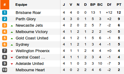 Car en signant son quatrième succès en quatre matchs, Brisbane prend seul la tête du championnat, profitant de la première défaite des Glory, tombés sur le terrain des Mariners. Central Coast, mené au score, en profite pour décrocher son premier succès de la saison et enfin lancer son championnat.