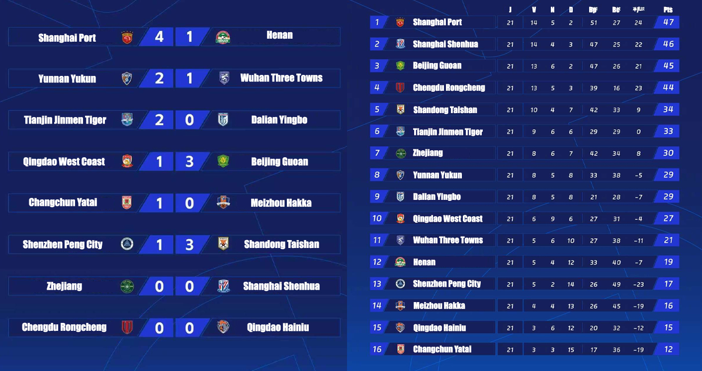 Parmi les autres résultats de cette vingt-et-unième journée, Shanghai Port FC l'emporte sans coup férir face au Henan FC (4-1), Yunnan Yukun s'impose face à Wuhan Three Towns (2-1), Tianjin prend les trois points face à Dalian (2-0), Beijing Guoan et le Shandong Taishan s'imposent tous les deux sur le même score (3-1), respectivement face au Qingdao West Coast et au Shenzhen Peng City. Enfin, le Chengdu Rongcheng et le Qingdao Hainiu se séparent eux aussi sur un score de parité vierge de tout but.
