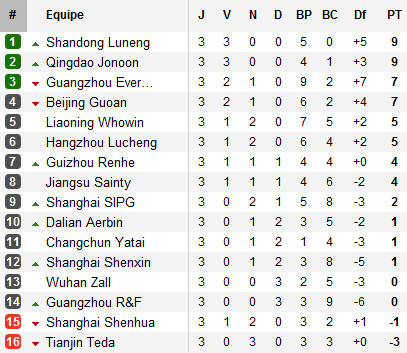 Trois journées de disputées et seuls Shandong et Qingdao réalisent le parcours parfait. Le club le plus titré du pays n’a toujours pas encaissé le moindre but et signe un joli succès sur le terrain des Argenlic de Guangzhou en pleine déroute (3 défaites en 3 matchs), lors de la troisième journée alors que Qingdao s’impose à Changchun autre équipe en difficulté. Derrière le duo, les Evergrande de Lippi concèdent leurs premiers points lors du choc de la troisième journée face à Beijing alors que Jiangsu et Dalian Aerbin accusent déjà un certain retard malgré le premier but d’Hoarau pour les Faucons bleus.