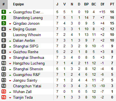 Derrière, seul Qingdao parvient à demeurer invaincu après avoir également arraché le nul à dix contre onze dans les derniers instants du choc l’opposant à Liaoning. Pendant ce temps, le Dalian de Guillaume Hoarau remonte comme une fusée. Victoire convaincante à Beijing (3-0), la troisième en quatre matchs, et voilà les Aigles bleus à six points du leader. En queue de classement, Tianjin s’impose pour la première fois de la saison chez lui devant le promu Wuhan (malgré le premier but de Gara Dembélé) et revient ainsi à zéro en termes de points.