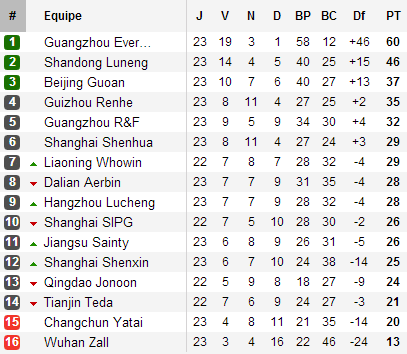 Car devant, Guangzhou est tombé ! Opposé au Teda, engagé dans une terrible lutte pour le maintien, les Evergrande encaissent un but d’entrée de match et ne parviennent jamais à revenir dans la partie. Première défaite en championnat cette saison et première fois depuis près de trois mois que les hommes de Lippi restent muet (toutes compétitions confondues). Avec ce succès, Tianjin reste au-dessus de la zone rouge malgré le succès de Changchun face à un autre leader : Beijing. Le Guoan se montre impuissant chez l’avant dernier du championnat et s’incline donc logiquement 2-0. Tout cela aurait pu alors profiter à Shandong.