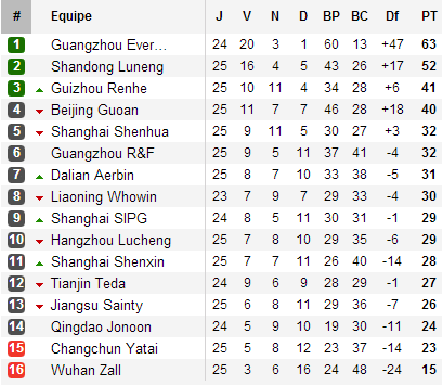 En queue de classement, si l’affaire est entendue pour Wuhan, ce que l’on redoutait semble se produire pour Qingdao. Les Jonoon concèdent une 6e défaite consécutive et voient revenir sur eux Changchun, vainqueur d’un Dalian sans Hoarau mais qui n’a plus que la Coupe pour animer sa fin de saison. Attention aussi à Jiangsu, tombé face au Shenhua, et qui se retrouve également à portée de tir de Changchun.