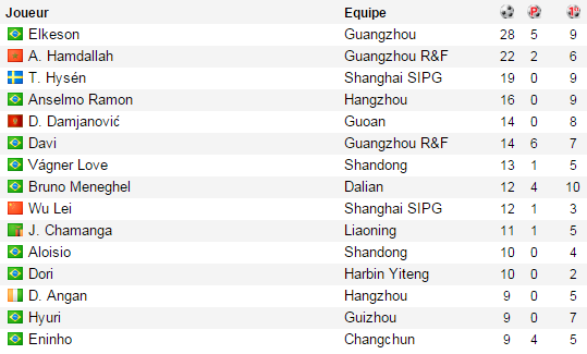 Pour d'autres, on attendait mieux. Et là je pense bien sûr à Gilardino et Diamanti, qui malgré leur trentaine, restent des attaquants de niveau international. Les deux terminent avec 5 et 4 buts au compteur (en 14 et 24 matchs). Une fois encore, ce sont surtout les joueurs étrangers qui se sont mis en évidence. Un fait simple montre la difficulté qu'ont les joueurs Chinois à s'imposer et élever leur niveau de jeu : un seul est présent dans le top 15 des buteurs. Il s'agit de Wu Lei, auteur de 12 buts (15 buts en 2013). Âgé de 22 ans, l'attaquant de Shangai SIPG, est bien l'un des rares joueurs de sa jeune génération à s'imposer dans son championnat.