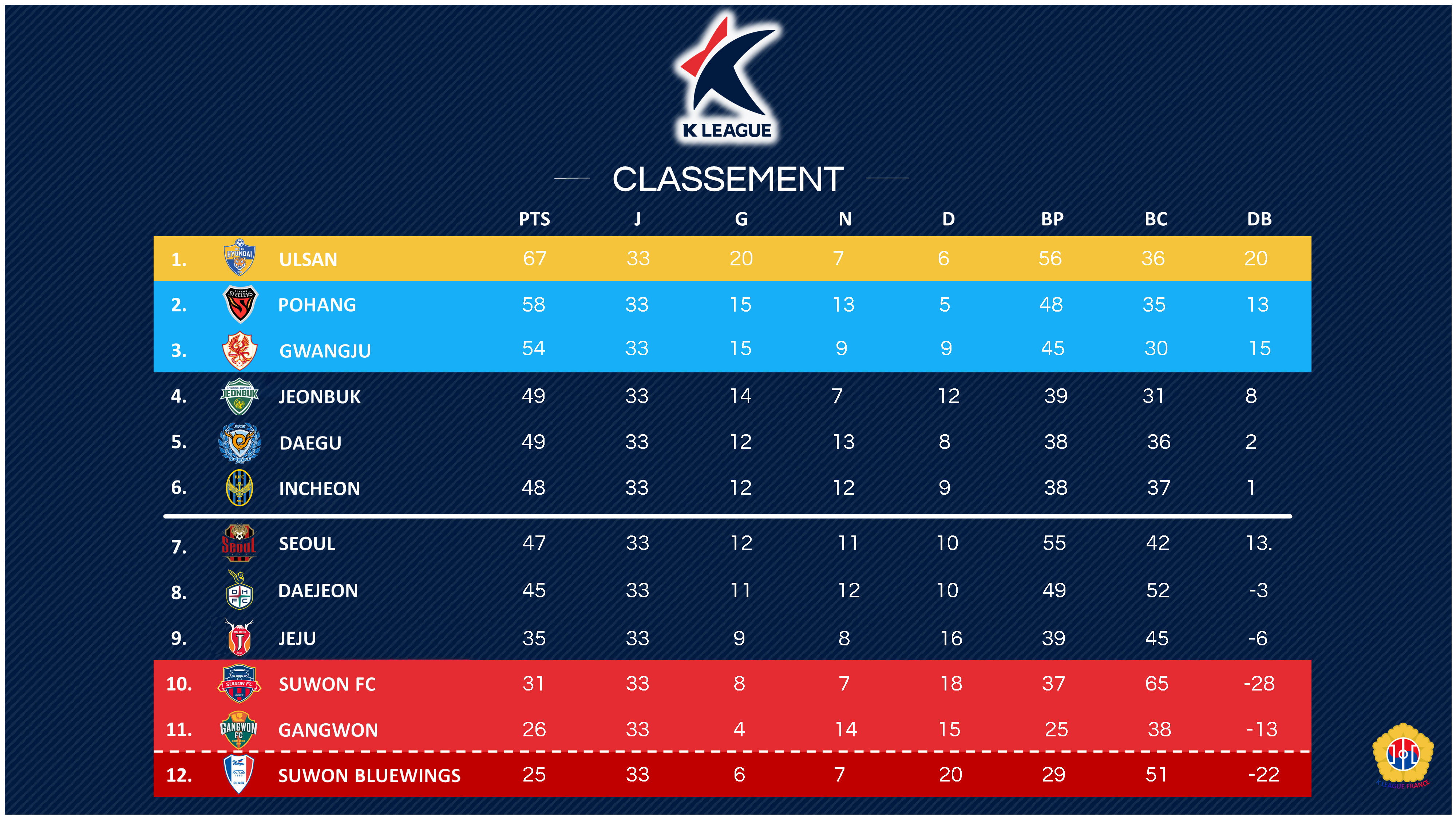 Les Steelers auront-ils des regrets à la fin de l'année ? Très certainement. Face à une bien pauvre équipe des Bluewings, Pohang a perdu une nouvelle occasion de revenir sur Ulsan. Dominateurs et plaisants à voir jouer, les Steelers ont manqué d'efficacité. Un manque payé très cher puisque les Bluewings ont inscrit l'unique but du match sur leur première opportunité grâce à une superbe frappe de Kim Joo-chan. Pohang a bien poussé tout le reste de la rencontre sans succès. Une défaite qui fait tache face au dernier du classement et qui laisse Ulsan s'échapper. L'écart entre les deux rivaux est désormais de neuf points. Pour les Bluewings, c'est la première victoire depuis l'arrivée de Yeom Gi-hoon sur le banc et la première depuis cinq matchs. Ce qui leur permet de revenir à un petit point de Gangwon, premier barragiste. En revanche, Lee Jong-seong a été expulsé et manquera le prochain match.