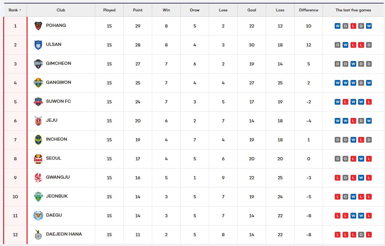 Pour son retour sur le banc de Jeonbuk, Kim Do-heon espérait décrocher un premier succès face à Gangwon. Mais les Bears n'en avaient que faire, eux qui courent après le podium. D'entrée de jeu, Kim Dae-woo adressait une longue passe en profondeur dans l'axe du terrain pour Yang Min-hyeok qui parvenait à tromper Jeong Min-ki dans un angle fermé. Douche froide pour les Green Warriors qui allaient devoir courir après le score. Seulement vingt minutes plus tard et une frappe de Lee Yeong-jae, Jeonbuk revenait à hauteur. Un soulagement de courte durée dans cette rencontre sans grosses occasions puisque à l'heure de jeu, Jeon Byung-kwan voyait rouge et laissait ses coéquipiers à dix. Jeonbuk se mettait alors à reculer et à subir. Sur un centre de Lee Gi-hyuk, Yago prenait le meilleur sur Lee Jae-ik pour tromper de nouveau Jeong Min-ki et donner l'avantage à Gangwon. Les Bears ne relâchaient pas pour autant la pression et manquaient deux énormes occasions sur la fin de match. Sans conséquence puisque Gangwon s'impose. Yoon Jong-hwan a réussi à stabiliser la défense de cette équipe et mérite amplement sa quatrième place au classement. À deux points du troisième, Gimcheon. Pour Jeonbuk, les matchs se suivent et se ressemblent. Jamais sur ces dernières années les Green Warriors n'ont été si faibles.
