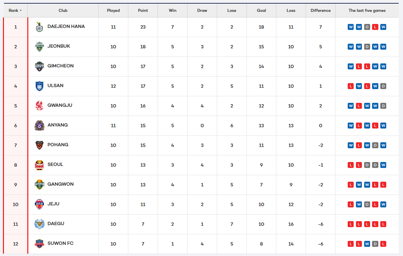 Enfin, dans le bas du classement, ça ne s’arrange pas pour Daegu et Suwon FC qui enchainent les défaites et se retrouvent logiquement derniers.