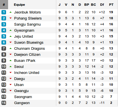 Difficile de se concentrer sur le terrain dans de telles conditions. Pourtant, cette neuvième journée aura connu l'une des plus belles rencontres de la saison entre Sangju Sangmu et le champion sortant Seoul. Sept buts (dont le huitième du meilleur buteur du championnat Kim Jung-Woo), un chassé croisé de 90 minutes et Seoul s'impose et lance enfin sa saison (deuxième victoire de rang). Cette défaite de Sangju profite à Jeonbuk qui s'impose devant Ulsan et prend la tête après la défaite de l'ancien leader Pohang à Busan.