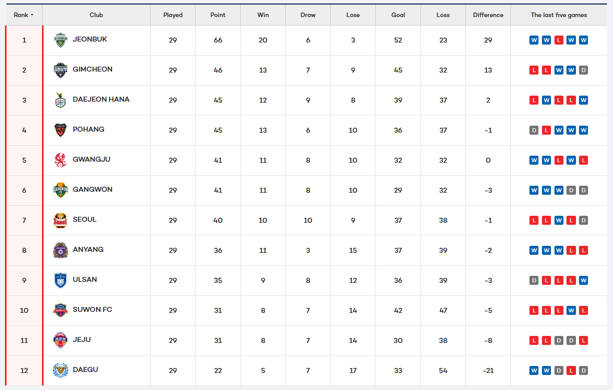 Derrière, Gimcheon a subi le réveil de Daegu. La lanterne rouge n’a plus le droit à l’erreur pour espérer se maintenir et enchaîne ici une seconde victoire consécutive très précieuse (1-2). Même si le gap avec la place de barragiste est de 10 points, les Sky Blues peuvent mettre le doute dans la tête de ses concurrents. Les militaires, de leur côté, laissent filer Jeonbuk encore un peu plus, avec un écart de vingt points.