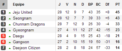 Dans la seconde moitié du tableau, la lutte pour la survie voit Daegu manquer l’opportunité de revenir sur Gyeongnam après son nul face à un Gangwon probable condamné.