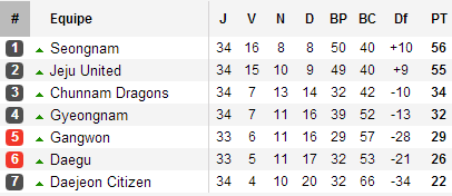 Si la lutte pour le titre est passionnante, celle pour le maintien l’est tout autant. Au repos ce week-end, Gangwon voit ses concurrents directs tomber : Chunnam est battu chez lui par Jeju, Gyeongnm perd à Seongnam. Conséquences, en cas de succès lors de son match de retard, Gangwon pourrait revenir à hauteur de Gyeongnam, à deux points de Chunnam et ainsi tout relancer.