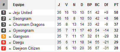 Dans l’autre groupe, celui de la relégation, tout est relancé. En s’imposant à Gyeongnam, Gangwon recolle en effet à sa victime du week-end et peut donc encore espérer le maintien. La défaite du premier non relégable est d’autant plus intéressante pour le suspense car dans le même temps, Daegu et Daejeon se sont imposés. Il n’y a donc que quatre points séparant ces quatre équipes. Une seule sera certaine d’être sauvée.