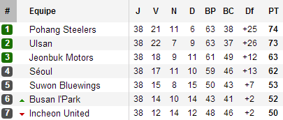 Tout est donc prêt pour une superbe 38e journée : Ulsan – Pohang, la grande finale du championnat, deux points séparent les deux équipes au coup d’envoi. Un nul suffit aux Tigres. Et Ulsan tiendra. Les minutes défilent, les Tigres vont être couronnés. Il suffit de tenir. Dernier coup-franc, 94e minute. Toute l’équipe des Steelers est dans la surface. Une panique énorme, un ballon qui revient sur Kim Won-Il et le ciel s’effondre sur la tête d’Ulsan. Un but au bout du suspense, Pohang s’offre le doublé, une incroyable conclusion à une saison qui avait pourtant laissé bien des inquiétudes lors de son coup d’envoi. L’heure ainsi de rappeler que Pohang, en grande difficulté financière, avait alors été contraint à faire la saison qu’avec des joueurs locaux, se privant de tout renfort étranger. De là à y voir un symbole. Reste que certains y voient surtout une baisse de niveau d’une K-league qui aura eu encore du mal à attirer dans les stades, la formule en deux parties ayant juste réussi à mettre plusieurs équipes en vacances plusieurs semaines avant la fin du championnat.