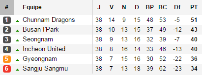 La lutte pour le maintien n'aura concerné que trois équipes : Sangju Sangmu, Gyeongnam et Seongnam. Pour Incheon et Chunnam, leur avance était suffisante dans ce mini championnat et ils n'ont pas été bien spectaculaires. Pour Busan, les deux premiers matchs remportés face à Incheon (1-0) et Sangju Sangmu (3-2) les ont rapidement mis à l'abri de la relégation.