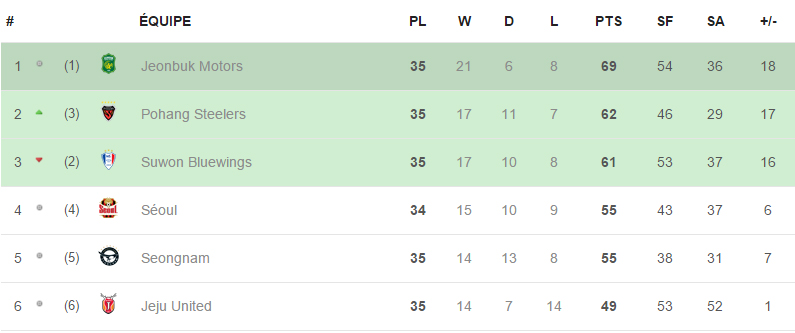 Le leader Jeonbuk peut lui encore voir venir, avec 7 points d'avance sur son nouveau dauphin Pohang. Une seule victoire sur les 3 derniers matchs lui permettrait d'assurer un second titre consécutif.