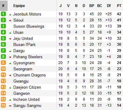Six matchs, six victoires : le rythme suivi par Jeonbuk a déstabilisé la tête de la K-league. Quatrième à cinq points du leader Suwon au soir de la 13e journée, le champion sortant est désormais seul leader devant le dauphin d’alors : le FC Séoul. Dernière victime, la lanterne rouge Sangju tombe sur un doublé du chilien Hugo Droguett.