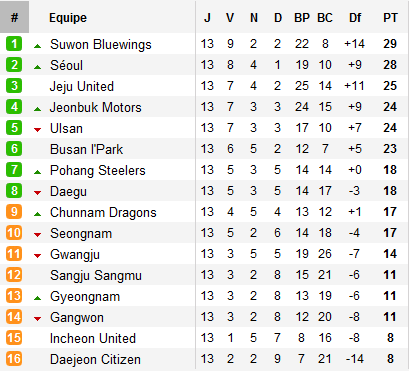 Suwon – Ulsan, le choc au sommet de la 13e journée venait presque conclure un week-end où chaque favori a tenté d’assoir son statut. Tout avait commencé par la victoire étriquée du Séoul de l’intenable duo Damjanović – Molina qui offrait la première place au club de la capitale car dans le même temps, Jeju s’inclinait sur la pelouse des Dragons de Chunnam.