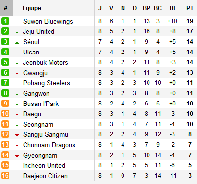 Il fallait bien ces deux succès pour y parvenir car derrière, Jeju ne relâche pas. Après un résultat nul lors de l’affiche de la septième journée l’opposant à Ulsan, actuel quatrième, Jeju s’en est allé dominer le grand perdant de la semaine, Pohang, grâce notamment à un doublé de Santos Junior. Deux points séparent désormais les deux premiers du classement avant le choc Seoul – Jeju du week-end prochain.