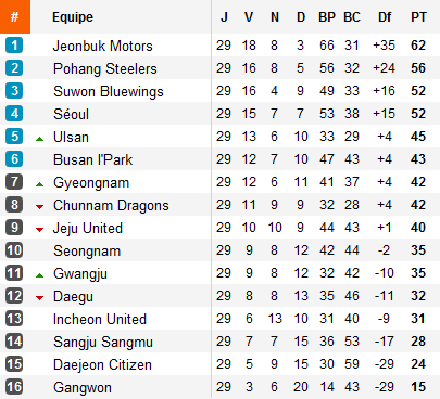 Devant, si Jeonbuk est assuré d’accéder à la grande finale en tant que vainqueur de la saison régulière et si Pohang sait qu’il jouera la demi-finale, la dernière incertitude concerne Séoul et Suwon. Actuellement au coude à coude dans la lutte à la troisième place, leur classement final décidera de leur adversaire pour le premier tour des play-offs. Tous deux victorieux ce week-end (avec notamment un but « Trézéguien » signé Ristić), difficile de prédire qui craquera sur la dernière ligne droite.