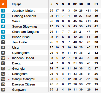 Derrière, les Steelers maintiennent la pression et s'accrochent à leur seconde place (rappelons-le, qualificative pour la demi-finale) et s'imposant à Incheon. A l'image du duo de tête, les deux autres poursuivants s'imposent : Séoul domine Busan lors de l'affiche de la journée (2-1 but de la victoire inscrit dans les derniers instants du match par Jung-Hoon Kang) alors que Suwon s'impose chez le dernier Gangwon.