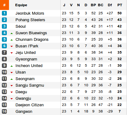 Sept matchs, sept victoires. En alignant une telle série, le champion en titre fonce vers les premières places. Dernière victime de la furia FC Seoul, la lanterne rouge Gangwon. Avec une seule victoire et quatre nuls en 23 journées, on se doutait que le dernier allait souffrir au World Cup Stadium, mais pas à ce qu'il soit autant écrasé. Avec l'intenable duo Damjanović (19 buts en 23 journées) – Molina, le FC Seoul balaye Gangwon 6-3 et reste au contact de Pohang (un point de retard). Car les Steelers ne faiblissent pas et s'imposent chez eux devant Gyeongnam.