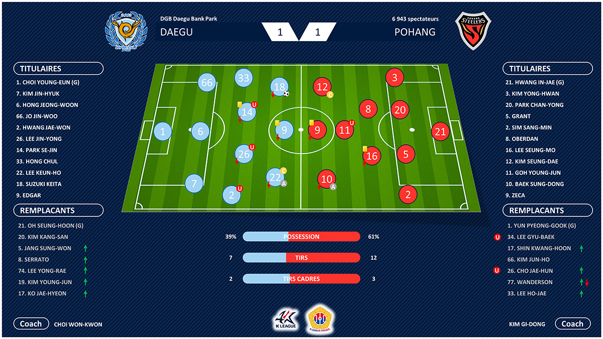 Ce sont les Steelers qui tirent finalement les premiers dans ce match avec une tête puissante d’Alexander Grant sur un corner de Baek Sung-dong (21e, 0-1). Loin de se laisser abattre, Daegu réagit un quart d’heure plus tard par Suzuki Keita dont la frappe, déviée par Park Chan-yong, surprend Hwang In-jae (38e, 1-1). En seconde période, les attaquants des deux camps se montrent maladroits comme Kim Seung-dae dont la reprise au point de pénalty est complètement dévissée ou encore Goh Young-jun qui manque son face à face avec Choi Young-eun. Dans le camp d’en face, c’est Ko Jae-hyeon et Edgar qui n’ajustent pas leur tentative. Le score n’évolue pas, Steelers et Sky Blues se quittent dos à dos. Un résultat qui ne convient à personne puisque Pohang descend du podium alors que Daegu se rapproche de la zone rouge.