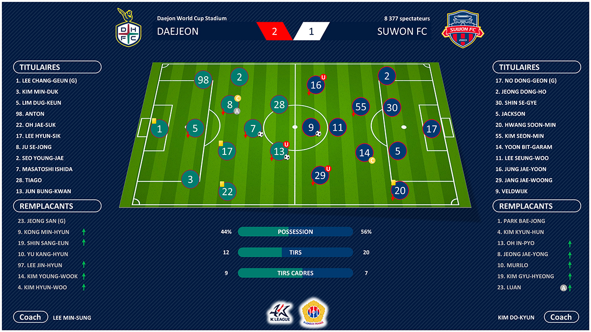 Pas encore rentré dans son match, le Suwon FC manque de faire surprendre par une belle combinaison entre Tiago et Lim Dug-keun mais ce dernier ne cadre pas sa frappe. Sur l’action suivante, les visiteurs pensent inscrire le premier but mais Lee Chang-geun réalise un arrêt exceptionnel devant Jackson. Bien en place, le Suwon FC offre le premier but à Daejeon. Surtout No Dong-geon qui met trop de temps à dégager le ballon et se fait contrer par Masatoshi Ishida qui ne se prive pas pour se rappeler au bon souvenir de son ancien club (16e, 1-0). Juste avant la pause, le portier se rattrape en sortant un double arrêt face à Jun Bung-kwan puis Masatoshi Ishida. Au retour des vestiaires, c’est au jeune attaquant de Daejeon de se rattraper puisqu’il envoie une superbe frappe au fond des filets (56e, 2-0). Piqué au vif, le Suwon FC trouve enfin la faille cinq minutes plus tard. Murilo sert parfaitement Lars Veldwijk dans la profondeur. Le Sud-africain croise sa frappe pour réduire l’écart. Sur l’engagement, Lee Seung-woo chauffe les gants de Lee Chang-geun par deux fois. Le portier de Daejeon, en feu, sort deux minutes plus tard une puissante frappe de Murilo. Le Suwon FC pousse toute la fin de match, sans succès. Daejeon renoue avec le succès et grimpe au troisième rang alors que Suwon FC reste sixième.