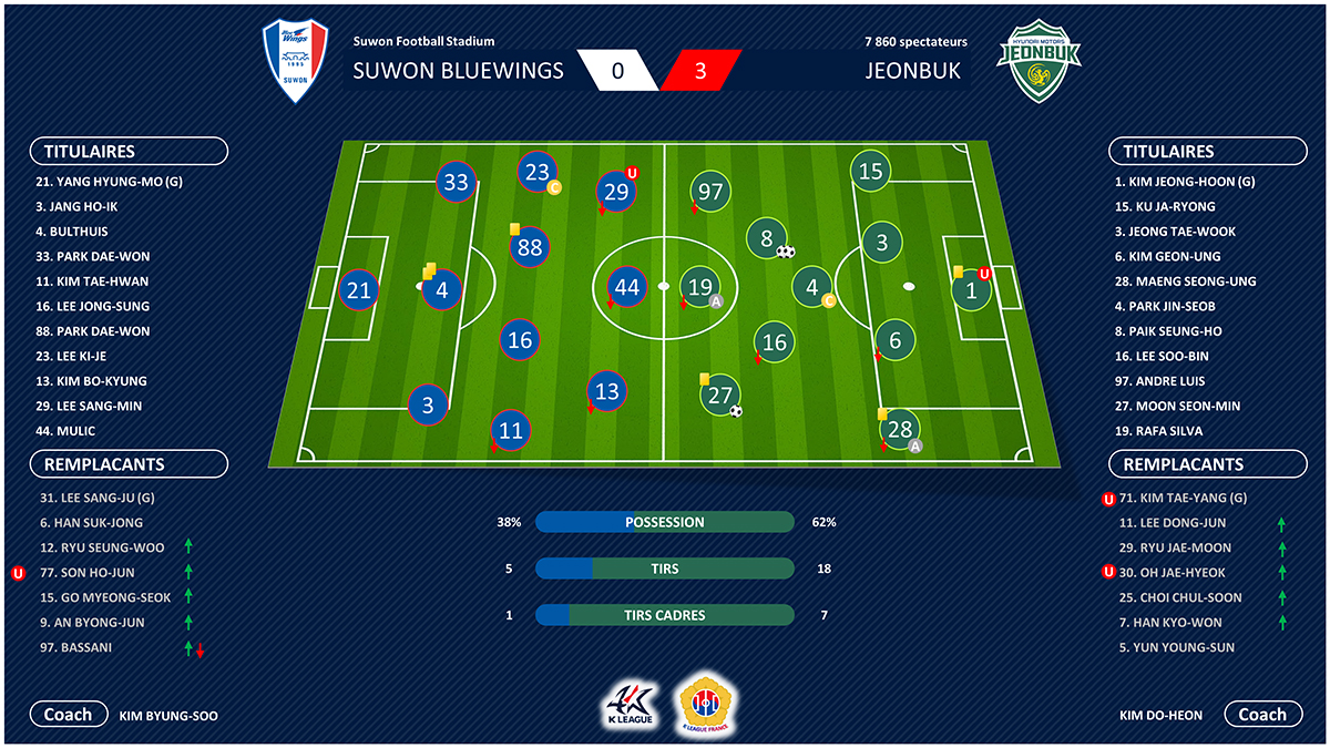 Malgré l’arrivée d’un nouvel entraîneur, les Bluewings sont malades et il faudra du temps pour se relever. Du temps que ne laisse pas Jeonbuk. Comme face au FC Seoul, les Green Warriors frappent très tôt dans la rencontre par Moon Seon-min, bien servi dans le dos de la défense par Maeng Seong-ung (1e, 0-1). Un début catastrophe pour les Bluewings qui ne s’en relèvent pas. Dix minutes plus tard, Moon Seon-min trouve Andre Luis qui voit sa tête être captée par Yang Hyung-mo. Alors que les offensives des Bluewings se heurtent à une défense bien en place des Green Warriors, ces derniers, loin d’être à leur meilleur niveau, se montrent toutefois plus tranchant. À la fin de la première mi-temps, Moon Seon-min profite d’une défense laxiste de Bulthuis pour servir Rafael Silva qui remet à Paik Seung-ho, bien seul, qui trompe Yang Hyun-mo (41e, 0-2). Trop facile pour Jeonbuk. En seconde période, Suwon tente de réagir mais Ryu Seung-woo est trop court puis trop tendre alors que Bulthuis ne parvient pas à cadrer sa tête. Le baroude d’honneur puisque le reste du match est totalement à l’avantage des Green Warriors qui profitent de l’expulsion de Bulthuis pour un second carton jaune à l’heure de jeu. Sur le coup franc, Paik Seung-ho fait mouche et termine de couler les Bluewings (66e, 0-3). Si Jeonbuk retrouve le sourire et se rassure quelque peu, Kim Byung-soo prend conscience de l’énorme tâche qu’il lui faut accomplir avec une équipe bonne dernière.
