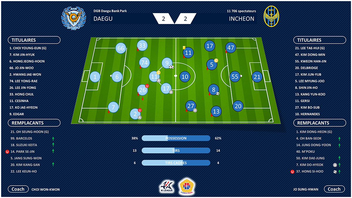 C’était Incheon qui démarrait le mieux la rencontre avec une première situation chaude par Hernandes de la tête après seulement quelques secondes de jeu. Mais le Brésilien, pas en réussite, voyait sa tentative s’envoler. Daegu mettait quelques instants avant de réagir et d’entrer dans son match et c’est l’inévitable Cesinha qui mettait à contribution Lee Tae-hui de loin. À la demi-heure de jeu, sur une belle action côté gauche, Kim Bo-sub servait Shin Jin-ho en retrait qui envoyait un plat du pied parfait dans la lucarne de Choi Young-eun (31e, 0-1). Dans la foulée, les Sky Blues se lançaient à l’attaque et Hwang Jae-won adressait un centre vers Edgar. L’attaquant brésilien trouvait le poteau de la tête. Au tout début de la seconde période, Edgar s’essayait de nouveau de la tête mais cette fois-ci manquait le cadre. Deux tentatives pour s’ajuster avant de frapper. Puisque sur un corner tiré par Cesinha, Edgar était trouvé au second poteau et trouvait les filets pour l’égalisation (51e, 1-1). Pas le temps de respirer puisque cinq minutes plus tard, Hwang Jae-won retrouvait sont attaquant brésilien de la tête pour une conclusion parfaite (56e, 2-1). Renversés en cinq minutes, les Durumi accusaient le coup. D’autant plus que dans la foulée de ces deux buts, Hernandes manquait son pénalty. Faisant le siège du but adverse, Incheon manquait de réussite et s’estimait heureux que Barcelos et Cesinha en manque également et ne tuent pas le match. La délivrance arrive finalement dans le temps additionnel puisque sur un long ballon, Kim Dae-jung prolonge pour Kim Do-hyeok qui talonnait pour Hong Si-hoo qui égalisait (92’ 2-2).