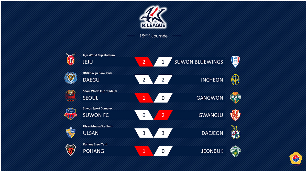 Trop d’erreurs fatales pour le moment côté Bluewings, ce qui les laisse bon dernier. Au contraire, Jeju n’en demandait pas temps et repart de l’avant tout en continuant cette surprenante série de sept matchs sans défaite. Les Insulaires sont toujours troisièmes.