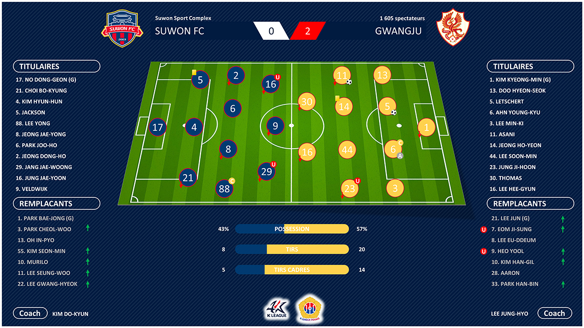 Une quatrième défaite de suite pour Suwon qui est en panne sèche et se voit être doublé au classement par son adversaire. Gwangju met fin à sept matchs sans succès et grimpe d’un rang.