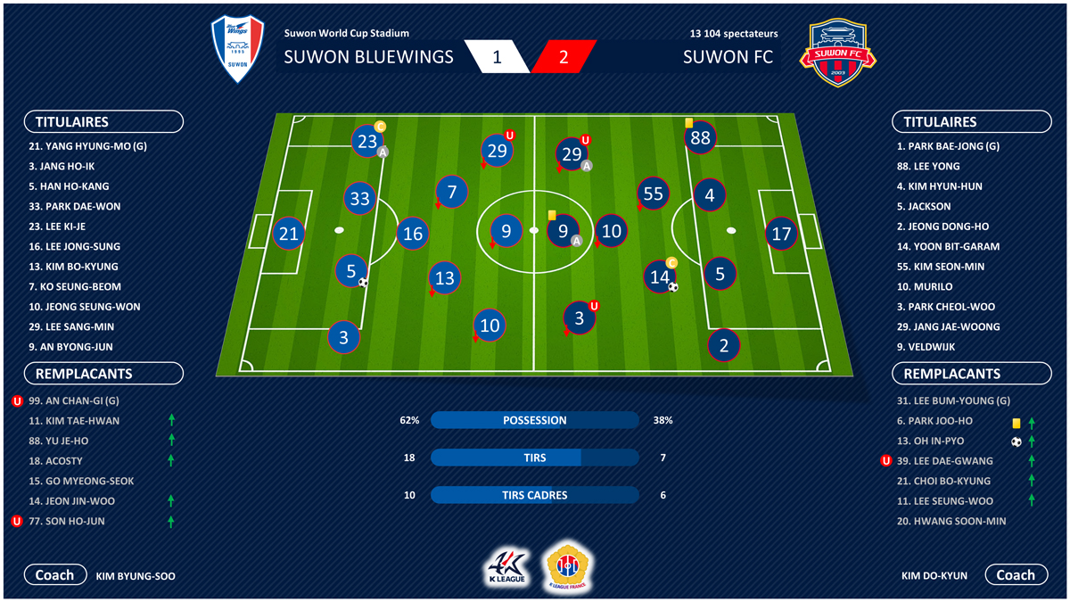 Le derby de Suwon prenait place au Big Bird avec un double enjeu pour les deux clubs : gagner un match et la suprématie de la ville. Pour les Bluewings, Kim Byung-soo revenait à un schéma tactique plus traditionnel en 4-1-4-1. Le rôle de sentinelle était confié à Lee Jong-sung, de retour, tandis que Jeong Sung-won complétait le trio offensif avec An Byong-jun et Lee Sang-min. Du côté de Kim Do-kyun et du Suwon FC, retour à une défense à quatre également pour essayer de stabiliser une arrière-garde en difficulté. Le club pouvait également compter sur Yoon Bit-garam, revenu de blessure et d’entrée titulaire.