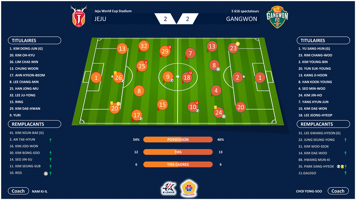 Jeju démarrait fort la rencontre avec une première opportunité superbe pour le jeune Kim Dae-hwan dont la lourde frappe échouait sur le poteau. Dans la foulée, Han Jong-mu pensait marquer le premier but du match mais une position de hors-jeu de Lee Ju-yong au départ de l'action annulait la réalisation du jeune milieu de terrain. Un avertissement qui réveillait les Bears. Derrière, Yang Hyun-jun récupérait un ballon haut et servait Kim Dae-won qui voyait son enroulé être repoussé sur le poteau par Kim Dong-jun. Les deux clubs se rendaient coup pour coup avant que Kim Dae-won ne débloque la situation pour Gangwon. Sur un service de Han Kook-young, il rééditait son enroulé qui terminait en lucarne (39e, 0-1). Douche froide pour les Insulaires qui réagissaient néanmoins avant la pause mais Lee Ju-yong manquait le cadre. En début de seconde période, Jeju revenait au score sur un coup du sort. Entré en jeu, Reis tentait sa chance de loin mais sa frappe heurtait la tête de Ahn Hyun-beom qui trompait Yu Sang-hun (46e, 1-1). C'est sur un second coup du sort que Jeju prenait l'avantage. Kim Dae-won remettait en retrait mais trouvait Yuri qui ne se privait pas pour tromper Yu Sang-hun (52e, 2-1). Jeju n'en demandait pas tant mais une fois en tête, s'arrêtait de jouer. Gangwon en profitait sans concrétiser dans un premier temps puisque Rim Chang-woo et Galego trouvaient Kim Dong-jun sur leur route. Finalement, à dix minutes de la fin, Kim Jin-ho transperçait la défense pour centrer devant le but. Park Sang-hyeok, surgissait pour pousser au fond et égaliser (80e, 2-2). Un résultat positif dans le jeu pour Gangwon, moins sur le plan comptable puisque les Bears restent toujours à bonne distance du premier non relégable. Jeju reste toujours invaincu mais ne profite pas de cette rencontre pour réduire l'écart avec Ulsan. Néanmoins, les Insulaires sont les nouveaux dauphins des Tigres.