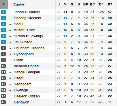 Reste la course à la seconde place, synonyme de demi-finale et aux accessits en playoffs. Avec cette défaite, Pohang voit Seoul et son irrésistible buteur monténégrin Dejan Damjanović (auteur d'un doublé lors de la victoire à Jeju) revenir sur lui (1 point sépare désormais les deux équipes). Busan, prochain adversaire de Jeonbuk et actuel quatrième, n'est qu'à quatre points, Suwon à cinq.