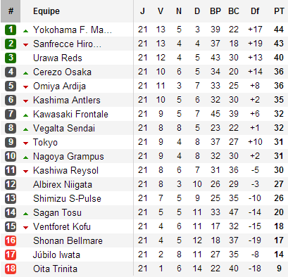 Derrière, le Cerezo a repris Omiya à la quatrième place, précédant Kashima d’un point alors qu’en queue de classement, la situation du Jubilo Iwata reste toujours plus préoccupante : avant-dernier de J-league, le Jubilo avec ses deux maigres défaites en 21 matchs se rapproche chaque jour de la relégation.