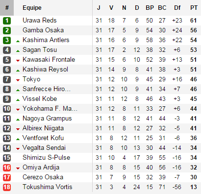A la fin de la 29ème journée, j'avais annoncé quatre prétendants à la poursuite des Reds : Gamba Osaka, Kashima Antlers, Sagan Tosu et Kawasaki Frontale. Depuis, Gamba est le seul club à pouvoir arrêter Urawa et semble pouvoir accrocher la seconde place. Pour les trois autres, il faudra certainement se contenter de la troisième. Parmi eux, Kawasaki est l'équipe qui a perdu le plus gros lors de ces deux dernières journées. Avec deux défaites face à Shimizu S.Pulse (3-2) et Ventforet Kofu (2-1) des mal-classés, le club d'Okubo se retrouve à trois points du podium qu'il occupait jusque-là. Sagan Tosu (une victoire et une défaite) et Kashima Antlers (une victoire et un nul) ont conservé leur rythme habituel et auront peut-être à se départager lors de leur rencontre à la dernière journée. Enfin, en plus de ces trois équipes un quatrième est en train de venir se mêler à cette lutte au podium, il s'agit de Kashiwa Reysol. Avec ses deux nouvelles victoires, face à des mal- classés cette fois (2-1 à Vegalta Sendai et 2-0 face à Tokushima Vortis), l'équipe de Nelsinho Baptista revient à seulement trois points de Kashima Antlers qui occupe actuellement la troisième place. Kashiwa Reysol reste sur une série de quatre victoires consécutives et aura l'avantage de ne jouer que des mal classés lors des trois dernières journées, tandis que ses concurrents auront quelques confrontations directes (Kashima recevra Tosu et Kawasaki frontale; Sagan Tosu recevra l'actuel leader Urawa).