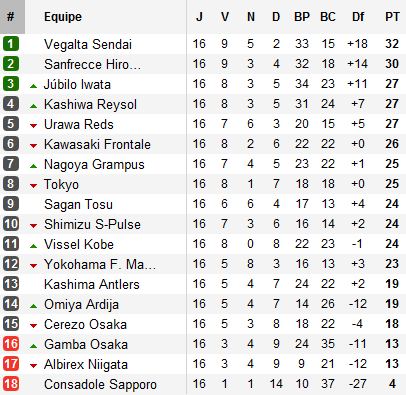 Ce succès permet à Kashiwa de poursuive sa remontée et s’approcher de la tête. Car devant, Vegalta et Sanfrecce restent dos à dos (2-2) et cèdent du terrain. Autre grand gagnant de la semaine, le Júbilo Iwata domine le FC Tokyo et monte sur le podium, profitant du nul concédé par Urawa à Osaka.