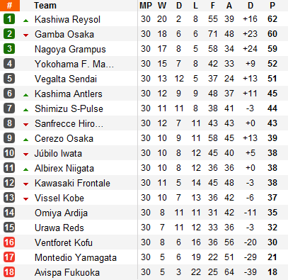Autre point chaud, la lutte pour le maintien. En s’inclinant à Niigata, l’Avispa Fukuoka est devenu le premier relégué de l’édition 2011 et devrait être suivi par le Montedio Yamagata la semaine prochaine.