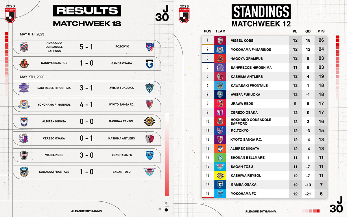 À noter que Urawa Reds a vu sa rencontre reportée pour cause de finale retour d’Asian Champions League, qu’il a par ailleurs remportée. Déjà trois matchs de retard pour les Reds, qui pourraient leur permettre de recoller au podium s’ils les remportaient tous.