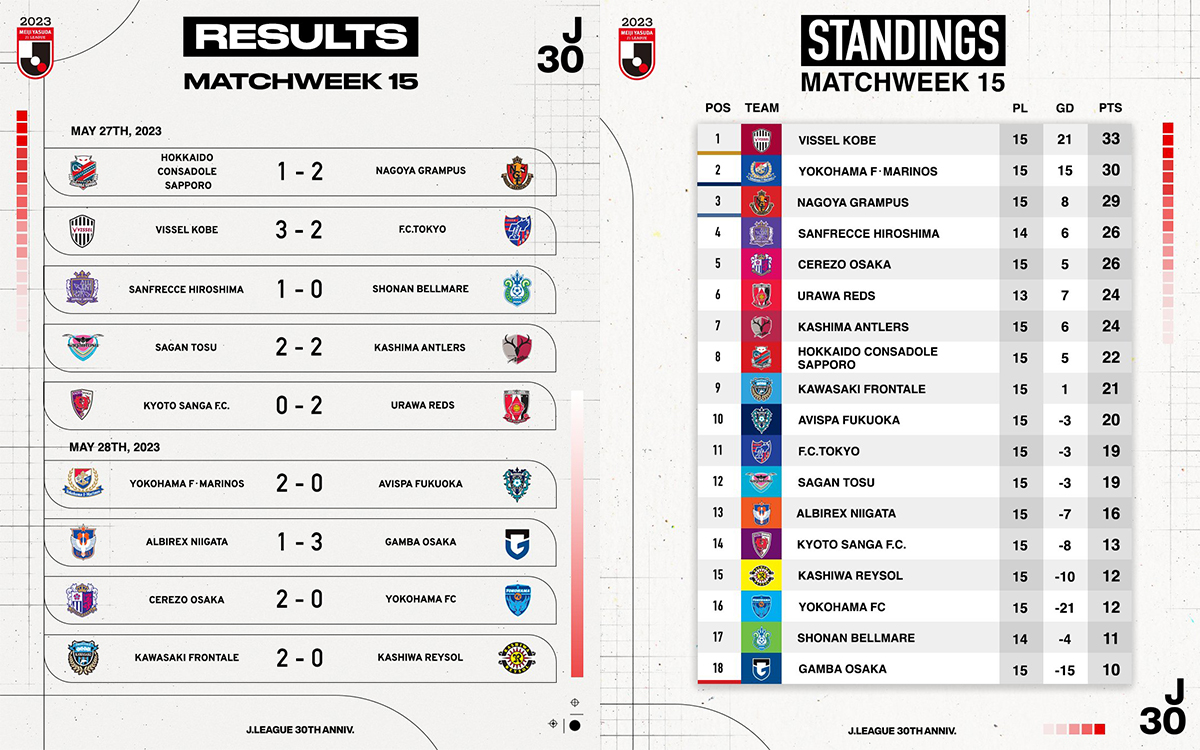 Les temps sont durs pour Kyoto Sanga et Shonan Bellmare, qui enchainent les déroutes, tandis que Gamba Osaka est parvenu à briser sa série noire. Tout va bien pour Vissel Kobe qui s’impose une nouvelle fois et poursuit son début de championnat idyllique. Cerezo Osaka se montre solide depuis trois rencontres et enchaine trois victoires pour trois blanchissages pendant que Kawasaki Frontale semble avoir retrouvé son football.