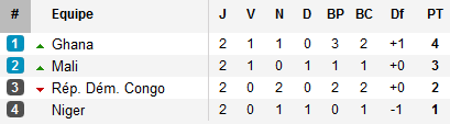 S’ils ne perdent pas leur dernier match, Ghana et Mali seront qualifiés. Reste que le Niger, qui a inscrit son premier point lors d’une CAN face au Congo et le Congo de Claude Le Roy peuvent encore se qualifier. Il faudra pour cela s’imposer et, pour le Niger, espérer que dans le même temps, le Mali n’arrache pas le nul face au Congo.
