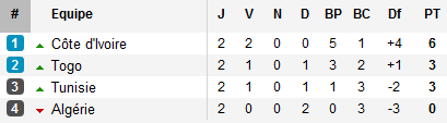 Avant même la dernière journée, une seule équipe est d’ores et déjà éliminée. Dominés par le Togo, les Fennecs de Vahid Halilhodžić quittent déjà la compétition. Déjà en froid avec la presse algérienne, venue l'invectiver en milieu de semaine, coach Vahid ne devrait pas faire long feu sur le banc de la sélection. Algérie éliminée, cela signifie également qu’il y a déjà un qualifié : la Côte d’Ivoire. Décevants en ouverture, les Eléphants ont largement dominé la Tunisie et sont de fait les premiers qualifiés. La dernière place se jouera donc dans la finale Tunisie – Togo.