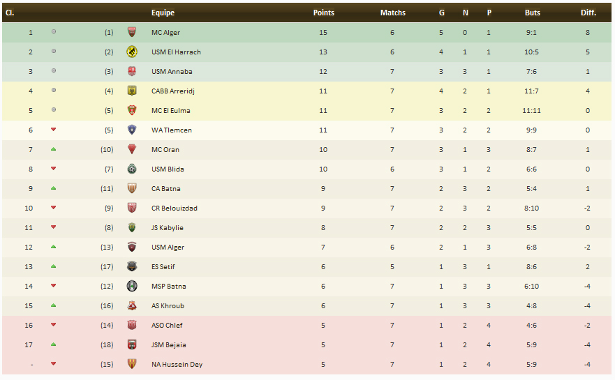 Ce qu'il faut retenir : Devant un trop grand nombre de derbys à disputer à Alger et le manque de stade pouvant accueillir ces derbys, la ligue algérienne a décidé de reporter le choc au sommet opposant le MC Alger, leader, à son poursuivant direct l’USM El Harrach. Au lieu de ce choc, la 7e journée algérienne nous a donc offert le duel spectaculaire entre USM Alger et le CR Belouizdad qui s’est terminé sur un final fou débouchant sur un match nul (2-2). La bonne affaire est pour le CABBA et le WA Tlemcen qui a ramenant respectivement 1 point de la pelouse du MC El Eulma et 3 points devant Blida, reviennent au contact des deux leaders. Derrière, l’ES Sétif et son nouvel entraîneur intérimaire Ali Mechiche, décrochent leur premier succès de la saison en écrasant le MSP Batna (4-1). Enfin, le JSM Bejaïa remporte son premier match de la saison devant la JS Kabylie, pour le derby de kabylie et abandonne sa place de lanterne rouge au NA Hussein Dey.