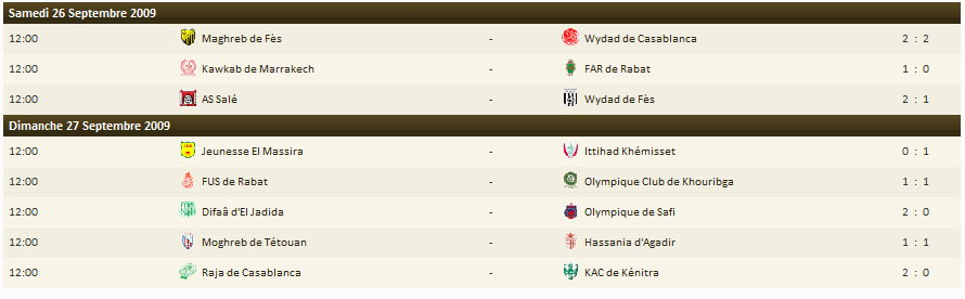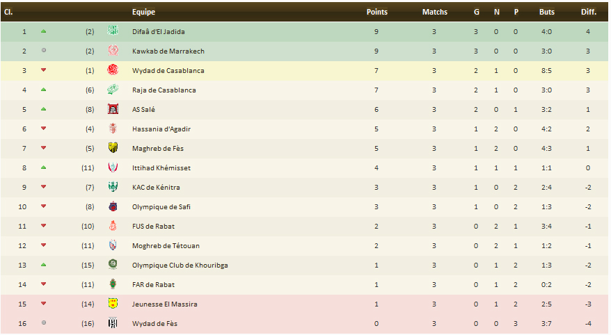 Ce qu’il faut retenir : Après une pause, le championnat marocain reprenait ce week-end avec la 3e journée. Ils ne sont plus que 2 à poursuivre leur sans faute : Difaâ d’El Jadida et le Kawkab de Marrakech. Le Difaâ a facilement écarté l’Olympique Saïfi (2-0), le Kawkab a battu le FAR (1-0) plongeant les joueurs de Rabat à la quatorzième place du classement, loin des objectifs de début de saison. Cette troisième journée est aussi l’occasion pour le Raja et le Wydad, grands favoris, de se replacer en 3e et 4e positions. Les hommes de Carlos Mozer s’imposent facilement devant le KAC alors que le Wydad arrache un bon match nul de son déplacement à Fès sur la pelouse du MAS. En bas de tableau, la situation se complique pour l’autre club de Fès. Battus par l’AS Salé, le Wydad Fès enchaîne sa troisième défaite en autant de matchs.