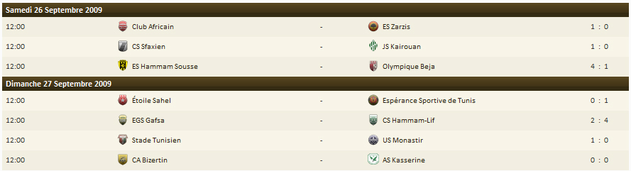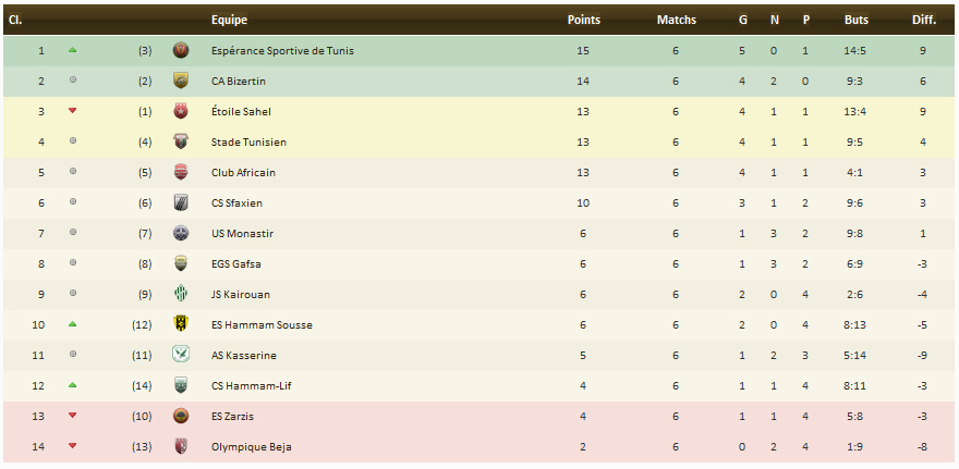 Ce qu’il faut retenir : L’affiche du week-end opposait deux grands favoris de l’édition 2010 : l’Etoile sportive du Sahel recevait l’Espérance de Tunis. De ce sommet, c’est l’espérance qui sort vainqueur et en profite pour récupérer son fauteuil de leader du championnat. Car dans le même temps, le CA Bizertin a été accroché chez lui par Kasserine. Autres favoris à se rapprocher, le Stade Tunisien et le Club Africain reviennent à 2 points de l’EST, en battant l’Union Sportive Monastirienne (1-0). En bas de classement, Hammam-Lif remporte son premier match de la saison en écartant l’ESG Gafsa (4-2) à Gafsa même, laissant ainsi la dernière place à l’Olympique Béja, écrasé à Sousse (4-1).